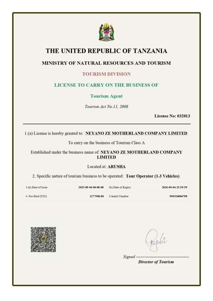 Neyano Ze Motherland is a proudly Tanzanian-owned travel company based in Arusha, specializing in unforgettable East African experiences. From iconic wildlife safaris to peaceful beach escapes and immersive cultural tours, we design journeys that capture the heart and soul of Tanzania.